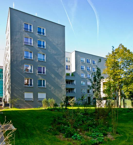 Die Wohnanlage Hansaallee an der Schnittstelle zwischen Westend und dem neuen Universitätscampus gelegen, ersetzt eine Wohnbebauung aus der Nachkriegszeit. Entlang der Hansaallee sind vier, von unterschiedlichen Architekten geplante, Wohnblöcke entstanden. Drei Punkthäuser im Innenhof komplettieren das Ensemble. Alle Gebäude sind im Passivhausstandard errichtet. Der sechsgeschossige U-förmige Block steht mit seiner Längsseite zur Hansallee. Das Haus interpretiert mit seinem zentralen Eingang, den zwei Treppenhäusern und seinen Mehrspännergrundrissen die Typologie des großen Mietshauses vor der Stadt neu.