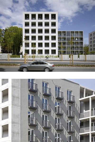 Das neue Wohnquartier an der Hansaallee folgt dem abschüssigen Terrain mit Straßen begleitenden Plateaus. Als Teil des Ensembles entsteht neben einem Kastanienhain ein sechsgeschossiges Passivhaus mit 35 Wohnungen. Die kompakte Kubatur erklärt sich aus der Massivität seiner Gegenüber – den neuen Fakultätsgebäuden am Campus Westend – und dem hohen Energiestandard, der nach einer Optimierung des Verhältnisses von Hülle zu Inhalt verlangt. Die stark gedämmten Fassaden sind symmetrisch aufgebaut und zeichnen sich durch weitgehende Reduktion aus. Hochrechteckige, dreifachverglaste Fenster sind scharf in den glatten Putz eingeschnitten. Zwei Eingänge betonen die Mitte und entwickeln sich mit tiefer Laibung aus der Fassade. Fensterbänke, Attika und Loggien sind aus Beton. Zur Vermeidung von Wärmebrücken stehen letztere frei vor dem Baukörper. Barrierefreiheit und das in der Fassade liegende Tragwerk erlauben flexible Grundrisse und generationenübergreifendes, komfortables Wohnen mit direktem Zugang zur unter dem Haus liegenden Tiefgarage.