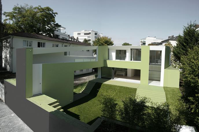 Die städtebauliche Anpassung und die Substraktion führen zu drei Unterschiedlichen Außenbereichen - 1. Eingang, 2. Vorgarten, 3. Garten. Die daraus resultierenden baulichen Strukturen bzw. Grünräume schaffen so einen eng mit dem Haus verknüpften und geschützten Gartenraum – eine grüne Oase mitten in der Stadt. Garten und Haus verschmelzen selbst zu einer fließenden Raumstruktur. Baukörper und Gartenraum antworten auf die plastische Struktur der heterogenen Gebäude-Rückseiten der Umgebung in unterschiedlicher Art und Weise - im Spektrum zwischen Permeabilität und Separierung. Dabei spielt der Umgang mit Schwellen zwischen öffentlichem Raum ( Straße / Blockrandstruktur ), halböffentlichem Raum ( Eingang, Vorgarten ), familiärem Raum ( Garten / Haus ) eine entscheidende Rolle. Signifikantes Beispiel dafür ist z.B. die Brückenloggia, die vieldeutige Raumbeziehungen generiert. In sofern können sich vielfältige Interaktionen und Verbindungen zwischen der Familie und der Nachbarschaft entfalten.