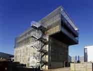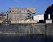 Die Umgestaltung des erst 1912 eröffneten Osthafens zählt in Frankfurt zu den größten städtebaulichen Herausforderungen der nächsten Jahre. Das Gebiet um die Großmarkthalle ist bereits vom Strukturwandel ergriffen. Im dahinter liegenden Teil des Osthafens aber befindet man sich plötzlich wie in einer anderen Welt. Hier, im Niemandsland zwischen Kiesbergen und Schutthalden, gestapelten Recyclingprodukten und Containern, die auf ihre Verladung warten, steht an der schnurgeraden, staubigen Strasse ein notdürftig als Wohnhaus getarnter Bunker aus der Zeit des Zweiten Weltkriegs. Immer auf der Suche nach günstigem Raum für künstlerische Zwecke, entstand die Idee, diesen Bunker zu einem kulturellen Ort werden zu lassen, ihn zum Motor für städtische Transformation zu definieren. Anlass war das undichte Walmdach, das teuer hätte repariert werden müssen. Ein Abriss kam wegen den enormen Kosten nicht in Frage. So ist der Bunker gewissermaßen zu einem hochgelegenen Bauplatz geworden. Wie auf einem Fels in der Stadt sitzt in Zukunft eine sparsam berechnete hölzerne Box, die Künstlerateliers und das Institut für Neue Medien beherbergen wird. Im schweren Betonkern werden dabei weiterhin Übungsräume für Musiker untergebracht sein. Eine umlaufende Erschließung fasst die leichte Holzschachtel und kehrt gleichzeitig die Gemeinschaftszone nach außen im Dialog mit der Stadt. Sie dient zugleich als Fluchtweg für die Ateliers. Die quergestellten Wandscheiben regulieren nicht nur den Sonneneinfall, sie beleben auch die Fassadengestaltung.