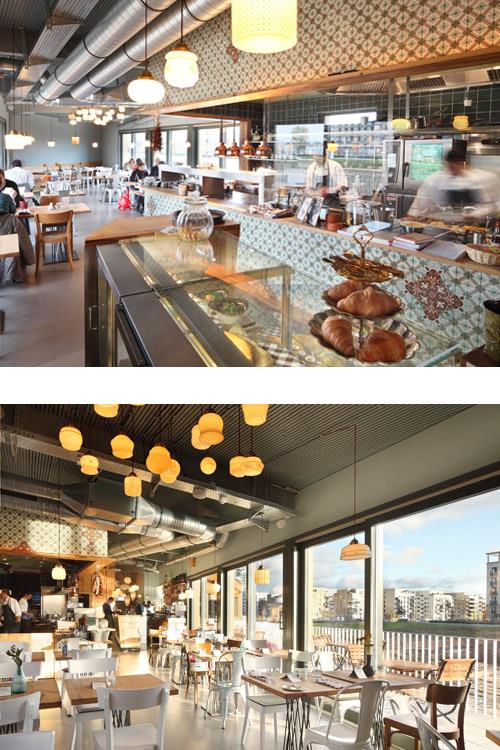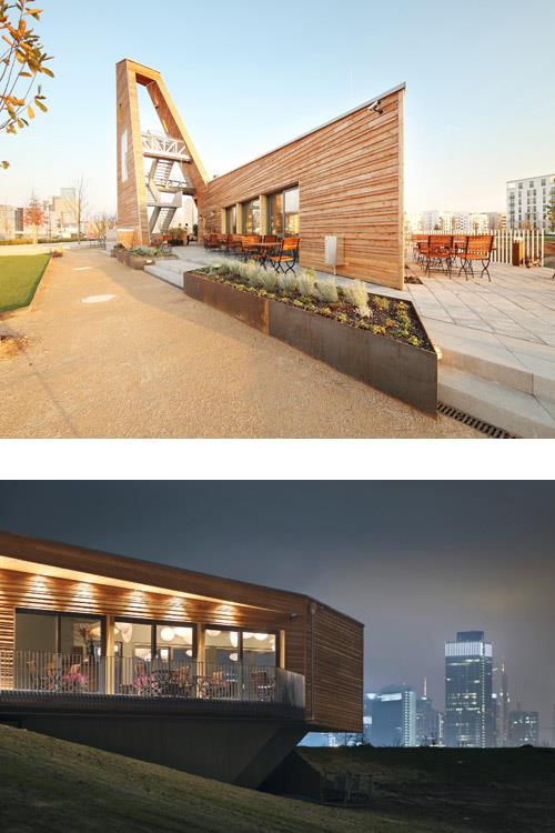 Die markante raumbildende Gestalt des multifunktionalen Pavillons ist von Weitem durch die Positionierung am Schnittpunkt des Parkwegs und der Promenade an der Pariser Straße gut sichtbar. Die Pavillon-Geometrie entwickelt sich aus einer kontinuierlichen skulpturalen Faltung, die sich über drei Gebäudeflügel spannt. Der erste Flügel liegt parallel zur Promenade und damit zur Baustelle der Untertunnelung des Europagartens. Er beherbergt die Gastronomie („Laubenesszimmer“) mit zweiseitiger Verglasung entlang der Hauptachse, durch die der Besucher zur einen Seite einen schönen Blick über die Baustelle und das wachsende Quartier hat und zur anderen auf die Außenterrasse mit Kräuterbeeten schaut, die sich an die Promenade anschließt. Der zweite Flügel, der als Besprechungsraum („Laubenwohnzimmer“) genutzt wird, liegt quer zur Hauptachse und kragt damit dramatisch über die Baustelle aus. Durch diese Lage eröffnet sich der Blick durch die ebenfalls zweiseitige Verglasung nach Osten über die Europaallee bis zur Skyline und nach Westen auf die Baustelle. Beide Flügel begleitend kragt außerdem ein Balkon über die Böschung der Baustelle mit bis in die Abendstunden nutzbarer Südwestausrichtung. Nach Abschluss der Baustelle kann hier eine weitere geschützte und zum Park orientierte Außenterrasse entstehen. Am Schnittpunkt beider sich zu den Spitzen verjüngenden Flügel faltet sich der dritte Flügel in die Vertikale und bildet so den Turm. Er markiert den Pavillon als Zeichen und definiert auch den Haupteingang. Von seiner begehbaren Plattform aus bietet sich ein spektakulärer 360°- Grad- Blick über das Europaviertel. Nach Betreten des Gebäudes öffnet sich der Blick in die Stadt-Landschaft durch ein Horizontalfenster genau im Schnittpunkt der beiden Flügel. Die Bar liegt direkt vor diesem Fenster und empfängt so die Besucher, die sich entscheiden können, ob sie ins „Wohnzimmer“ oder ins „Esszimmer“ gehen wollen. Das Highlight des „Esszimmers“ ist die offene Küche, die als „Feuerstelle“ symbolisch für Wärme, Licht, Essen und Gemeinschaft steht und das Herz des Gebäudes und des ganzen Europaviertels bildet. Das „Wohnzimmer“ ist mit moderner Verdunklungs- und Präsentationstechnik als Veranstaltungsraum professionell nutzbar. Der Gastronomieflügel ist komplett unterkellert und wird für Küchenlager, Umkleiden und Toiletten genutzt. Die Struktur des Gebäudes ist eine Holzständerkonstruktion mit Lärchenholzfassade, die inszenatorisch mit der Interpretation einer modernen Gartenlaube spielt. Dieses Motiv wird in der Innenraumgestaltung der Gastronomie weiterentwickelt. Dort offenbart sich den Gästen ein heller Gastraum mit viel warmen Holz, alten Küchenlampen und liebevoll zusammengestelltem Gartenhaus- und Küchendekor. Die Lage im Europagarten und das Miteinander stehen auch im gastronomischen Konzept im Mittelpunkt und klingen schon im Namen Laube Liebe Hoffnung an. Die frische saisonale Garten-Haus-Küche ist von dem inspiriert, was heimische Gärten, Felder und Wiesen bieten. Die offene Küche, ein Blickfang mit Mosaikfliesen, steht für das Miteinander. In diesem Sinne greift Laube Liebe Hoffnung die Architektur und den genius loci auf und verbindet beides zum ganz eigenen Ort mit Seele.