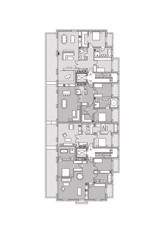 Das Wohngebäude bietet Raum für 20 Wohnungen des gehobenen Segments, die von zwei künstlerisch gestalteten Treppenhäusern erschlossen werden. Jeweils zwei Wohnungen lassen sich zu einer Großwohnung zusammenschalten. Nach Westen sind den drei Wohnungen des Erdgeschosses große Gärten vorgelagert. Das Penthouse zeichnet sich nicht nur durch einen Skyline-Blick aus, sondern auch durch großzügige, nach Westen orientierte Terrassen. Die Konstruktion des Gebäudes ist so gewählt, dass vom Loft über die Allraum-Wohnung bis zur klassischen Dielenwohnung alle wohnungsinternen Aufteilungsmöglichkeiten gegeben sind.