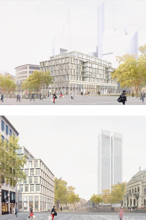 Aufgabe: Ziel der Wettbewerbsaufgabe ist die Neubebauung des Grundstückes Opernplatz 2 mit einer architektonisch und städtebaulich hochwertigen, eigenständigen Blockbebauung für eine Nutzung mit Büros und Einzelhandelsflächen. Die besondere Herausforderung liegt zum Einen in der Einfügung in das heterogene Umfeld und dem Umstand, dass der Neubau nicht mit der Alten Oper und den Hochhausarchitekturen konkurriert, gleichwohl aber als selbstbewusstes und wieder erkennbares Gebäude an einem äußerst prominenten Standort in den Stadtraum wirken soll. Durch seine vergleichsweise freigestellte Exposition besitzt das Gebäude im direkten Sinne keine Rückseiten, sondern muss gleichberechtigt auf die ‚steinerne’ Stadtseite als auch auf die ‚grüne’ Nachbarschaft zur Taunusanlage reagieren können.