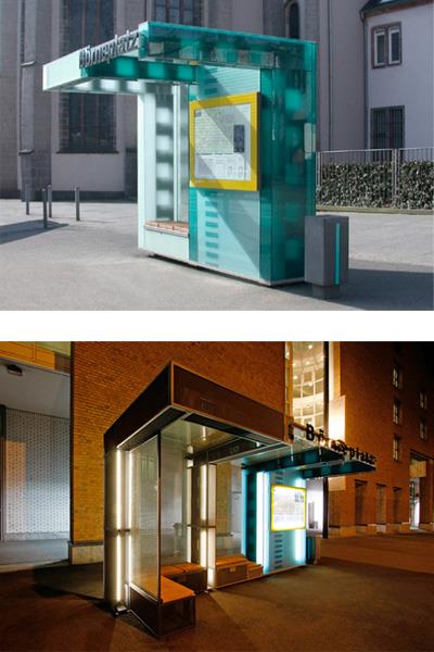 Als modulares Stadtmöbel folgt der Entwurf dem Konzept eines Baukastens aus Raumwinkeln. Die in horizontaler und vertikaler Richtung winkelförmigen Bauelemente definieren eindeutige Bereiche und schaffen damit räumlichen Halt. Gleichzeitig wird durch die hohe Transparenz der Buswartehalle insgesamt dem Sicherheitsempfinden der Wartenden Rechnung getragen. Auch die Möglichkeit des Über-Eck-Sitzens mit Blick zum ankommenden Bus erhöht die Aufenthaltsqualität der Fahrgäste in der Wartezeit. Infomodul, Sitzmodul und Ecksitzmodul sind je nach örtlicher Gegebenheit unterschiedlich kombinierbar. Von zwei Modulen für eine kleine Bushaltestelle bis zu 9 oder mehr Modulen für Stadtbahnhaltestellen sind unterschiedliche Kombinationen möglich. Die Raumwinkel entstehen durch eine Bekleidung der gelochten Stahltragkonstruktion mit diaphanen Materialien wie farbigem Glas, Streckmetall oder Gitterosten.
