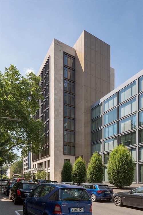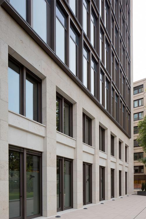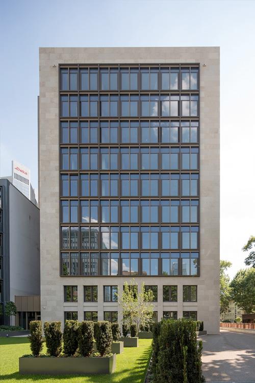 Das zehngeschossige Bürogebäude befindet sich in exklusiver Lage im Frankfurter Westend. Nach sechzehn Jahren Nutzungsdauer wies es einen Instandhaltungsrückstau auf. Es wurde neu verkleidet und tritt als steinerner Kubus auf, in den in jede Himmelsrichtung ein großes, über alle Regelgeschosse reichendes Fenster geschnitten ist. Im Sinne einer klaren Geometrie werden die bislang negativ ausgebildeten Gebäudeecken geschlossen. Das Haus interpretiert den Fassadenaufbau seines Nachbarn insbesondere bei der Kassettierung der Fenster neu. Je zwei Büroachsen werden durch einen etwa 300 Millimeter vor der Fassade auskragenden Metallrahmen gebündelt. Obwohl das Gebäudevolumen in den Grundzügen erhalten bleibt, wird durch eine Reorganisation der Grundrisse eine Effizienzerhöhung erreicht. Die Nutzfläche nimmt um etwa 700 Quadratmeter zu. Über eine Aufzugsgruppe erreicht man die beiden Tiefgaragengeschosse. Die Grundrisse sind im Ausbauraster von 1,35 Metern organisiert, so dass grundsätzlich eine effektive Aufteilung der Etagen in Einzel- und Mehrpersonenbüros möglich ist.