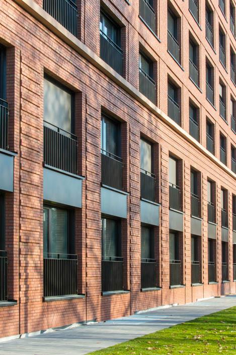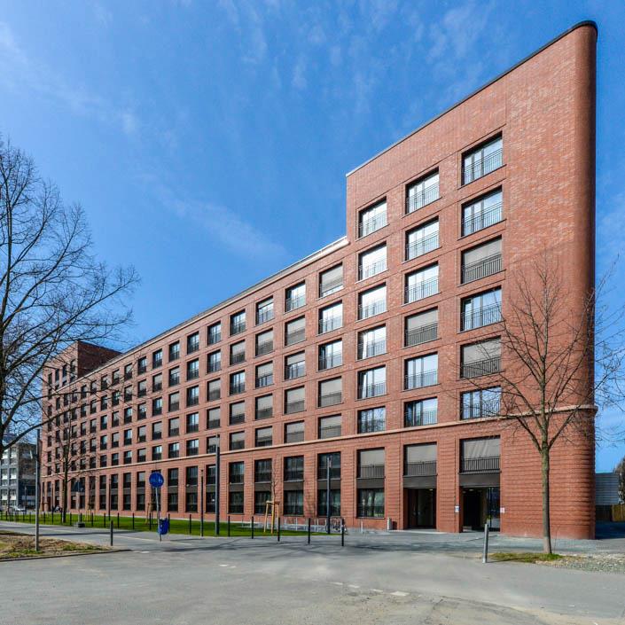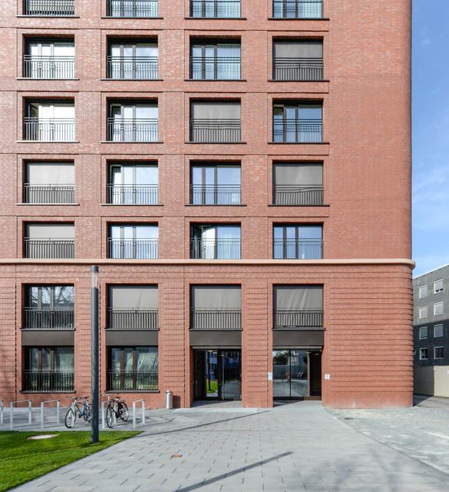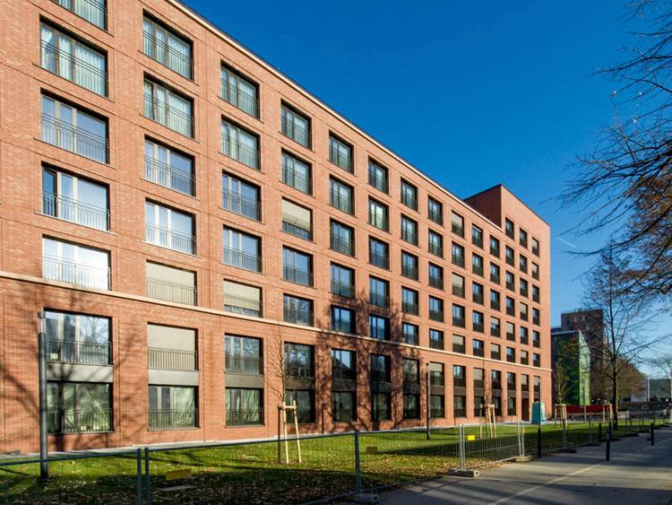 Im Frankfurter Nordend entstand zwischen Polizeipräsidium und dem Neubau der Frankfurt School of Finance & Management ein Studentenwohnheim mit 332 Appartements, Gemeinschaftsräumen, Laden und Tiefgarage. Das Haus orientiert sich mit seiner Großform an der Dimension der Nachbargebäude. Entlang der Adickesallee bildet das U-förmige Gebäude den neuen Blockrand und ermöglicht mit seinen Seitenflügeln eine zukünftige Anschlussbebauung. Die unterschiedlich erhöhten Ecken – die östliche fällt mit neun Geschossen um eines höher aus – reagieren jeweils auf die städtische Situation. Die Fassade ist straßenseitig durchgehend verklinkert und erinnert weniger an kleinteilige Appartementhäuser als an großmaßstäbliche Industriegebäude. Neben der turmartigen Ausbildung der Ecken betont ein breites Mittelrisalit den symmetrischen Aufbau des Gebäudes. Auf die Strenge der Vorderseite antworten auf der Rückseite alternierend angeordnete Balkone.