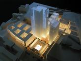 Zwei Hochhäuser setzen vertikale Akzente im neuen Quartier. Um sie von der Fußgängerperspektive aus in ihrer Dimension schrumpfen zu lassen, richtet sich die Höhe der Silhouette nach dem Frankfurter Dom. Auch zu den vorhandenen Hochhausclustern entsteht somit keine Konkurrenz.