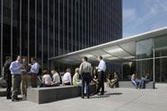 Das Foyer erhielt im Rahmen dieser Neugestaltung ebenfalls ein zeitgemäßes Erscheinungsbild. Die bewusste Beschränkung auf wenige, hochwertige Materialien wie Glas, gebürsteter Edelstahl und die transluzente Membran der Lichtdecke verleiht der Lobby eine elegante und zugleich moderne Anmutung. Der gläserne Café-Pavillon vis-à-vis zum Foyer fasst den Platz räumlich und gliedert ihn in einen vorderen, der Mainzer Landstraße zugewandten Bereich und einen ruhigen, hinteren Platzraum. Das Café wird, sobald es im August eröffnet ist, tagsüber sowie am Abend den urbanen Platz beleben.