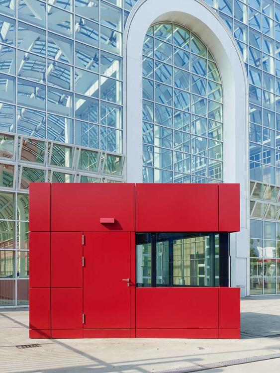 Ausgehend von der funktionalen Analyse wurde für die Wachgebäude eine auf einem gleichseitigen Dreieck basierende Grundriss-Form gefunden. Der dreieckige Grundriss bietet dem Wachpersonal optimale Sicht und verleiht den Bauten ihre starke Zeichenhaftigkeit, um sich so von den orthogonalen Großbauten des Messegeländes absetzen. Die rote Farbgebung unterstützt dabei die Signalwirkung der kleinen Gebäude und inszeniert die Unternehmensfarbe der Messe Frankfurt.