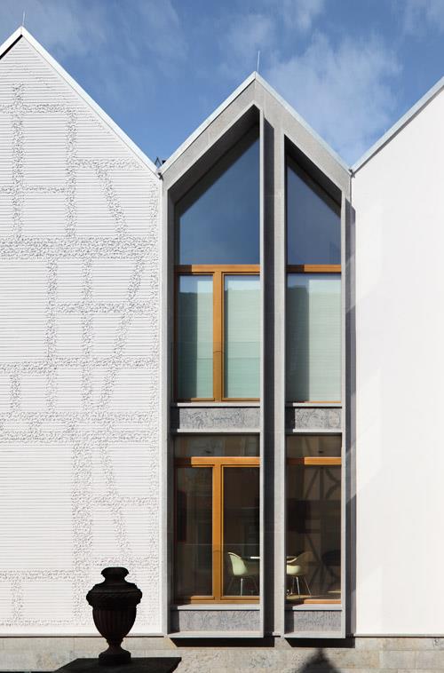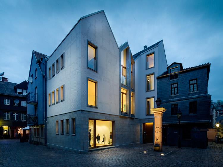 In der historischen Recherche kam zutage, dass die Lücke zwischen Vorder- und Hinterhaus einstmals geschlossen war. Der Baukörper des Neubaus nimmt diese Kubatur der Bestandsgebäude abstrahiert auf und schließt die Lücke mit einem dritten Baukörper. Es entsteht ein dreigiebliges Gebäude ohne Dachüberstände mit einem gläsernen Mitteltrakt. Der Sockel ist mit Naturstein verkleidet. Die Bauaufsicht Frankfurt wählte das Projekt zu einem Ihrer Leitprojekte im Bereich Wohnen für das Jahr 2012. „Die Planung greift in besonderem Maße das historische Erbe auf und schafft mit einzigartigen Elementen eine Brücke zwischen dem tradierten Stadtbild und modernsten Anforderungen und hat daher auch den Segen der Denkmalschützer.“1