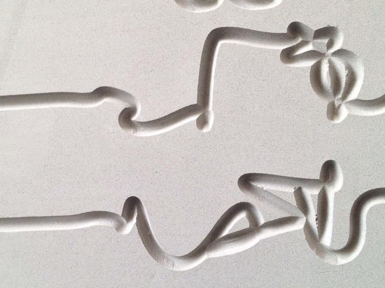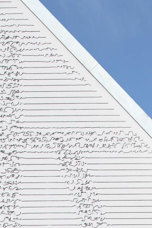 Der Zitterstrich könnte eine Schrift sein, die einen geheimen Text verschlüsselt. Nach Roland Barthes wird die Zeichnung des Fachwerks zum Zeichen. Aus parallelen Linien ohne jede Verbindung (Signifikant) entsteht im Betrachter das gedankliche Bild eines Fachwerks (Signifikat).2 Die mitschwingende Konnotation ist die einer an diesem Ort erwartbaren historischen Bauform, die als „traditionell“, „handwerklich“ und „heimatverbunden“ wahrgenommen wird. Dies unterstützt den Mythos der in Frankfurt vorherrschenden Erzählung, dass die vormoderne Zeit mehr Identität und Heimat stiften konnte als die zeitgenössische Architektur. Dieses Bild wird nun aber in der Annäherung an das Gebäude dekonstruiert. Das Zeichen verschwindet und es bleiben rätselhafte Einzelstriche, die zu zittern beginnen. Mit „Zitterstrich“ wurde an der TU Darmstadt in vordigitalen Zeiten das Überzeichnen mit Tusche von einer Vorzeichnung mit der freien Hand bezeichnet, bei der man den Rapidographen absichtlich in zarten Schnörkeln um die Ideallinie „zittern“ ließ, um damit einen lockeren Strich und Eleganz anzudeuten. Aber hier ist der Strich nicht Ausdruck eines Körpers, der sich schreibt, sondern einer Maschine, eines Programms, eines Automatismus. Die willkürliche Perfektion der ornamentalen Schnörkel entzieht sich jeder Lesbarkeit.