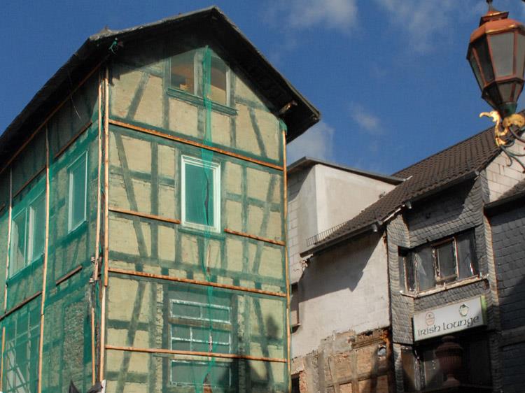 In der Fernwirkung erscheint durch den verdichteten Schwarzwert das Fachwerk als Andeutung um sich bei Annäherung in abstrakte Zitterstriche aufzulösen. Die Putzfassade lässt so das Fachwerk des Ursprungsbaus als „Nachbild“ durch eine maschinelle Fräsung wiederauferstehen, welche erst im Licht als Schattenriss erkennbar wird. Diese Reminiszenz an das alte Gebäude stellt einen subtilen und zeitgemäßen Umgang mit dem Genius Loci und mit dem Thema Rekonstruktion dar.
