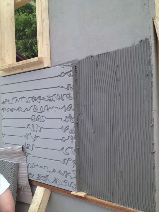 Für die Umsetzung in Putz entdeckte Franken Architekten StoDeco Plan, eine Granulatplatte des Putzspezialisten Sto, das dieser für die Rekonstruktion historischer Zierelemente und Leisten von Putzfassaden anbietet. Auf einer firmeneigenen Versuchsanlage des Bauherrn konnten auf Plattenrohlinge Muster mit einer 8 mm breiten und 5 mm tiefen Keilnut gefräst und in einem Probeaufbau montiert werden. Das Ergebnis war so überzeugend, dass der Hersteller Sto auf das von Franken Architekten entwickelte Verfahren aufmerksam wurde und mit viel Elan die endgültige Fertigung selbst übernahm. Der Datensatz für die 144 selbstähnlichen aber unterschiedlichen Platten wurde von Franken Architekten an Sto übergeben, der die Platten fertigte und an einen örtlichen Betrieb lieferte. Dieser montierte die Platten auf einem Wärmedämmverbundsystem. Das Nachbild des historisch unter Putz verborgenen unsichtbaren Fachwerkes wird nur durch den Schattenwurf der Keilnut sichtbar und wechselt je nach Lichtstand über den Tag hinweg sein Erscheinungsbild.