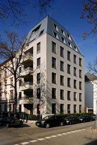 Der hohe Bestand an Gebäuden aus der Gründerzeit macht das Westend zu einem geschätzen Wohngebiet. Anstelle eines Bürogebäudes mit beliebiger Fassade entstand ein Haus mit Eigentumswohnungen, das aus städtebaulichen Gründen lediglich sechs statt der ursprünglich sieben Vollgeschosse einnimmt. So passt es sich der Höhe der Nachbarbauten an und ruft zudem in Form eines schräg zurückweichenden Daches die für das Westend typische Form des Mansarddaches in Erinnerung, abstrahiert jedoch die Typologie der Form. Durch einen mit der Kalkstein-Fassade identischen Farbton der Eternit-Deckung wirkt das Gebäude monolithisch, was durch die Lage auf einem Eckgrundstück besonders zur Geltung kommt. Regelmäßige Fensterreihen mit tiefen Laibungen und großzügige Balkone mit siebbedruckten Glasbrüstungen gliedern das Äußere. Die stumpf auslaufende Fläche über dem Penthouse ist als Dachterrasse ausgebildet. Unter dem Gebäude liegt eine Tiefgarage, die über einen Autoaufzug erschlossen wird.