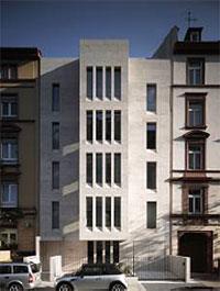 Aufzug und Treppenhaus zeichnen sich als Rückgrat des Hauses ab. Über beide werden die einzelnen Wohnbereiche erschlossen. Zur Straße hin zeigt sich das Gebäude bewusst schlicht, fast abweisend, wodurch die edlen Baumaterialien zur Geltung gebracht werden. Die präzise gefügte Natursteinfassade aus hellem Kalksandstein erweckt einen monolithischen Eindruck, der durch in der Farbe des Steins verputzte Fugen subtil verstärkt wird. Die massive Front ist durch hochrechteckige, in die Fassade eingeschnittene Fenster und einen mittig die Fassade beherrschenden Steinerker gegliedert.