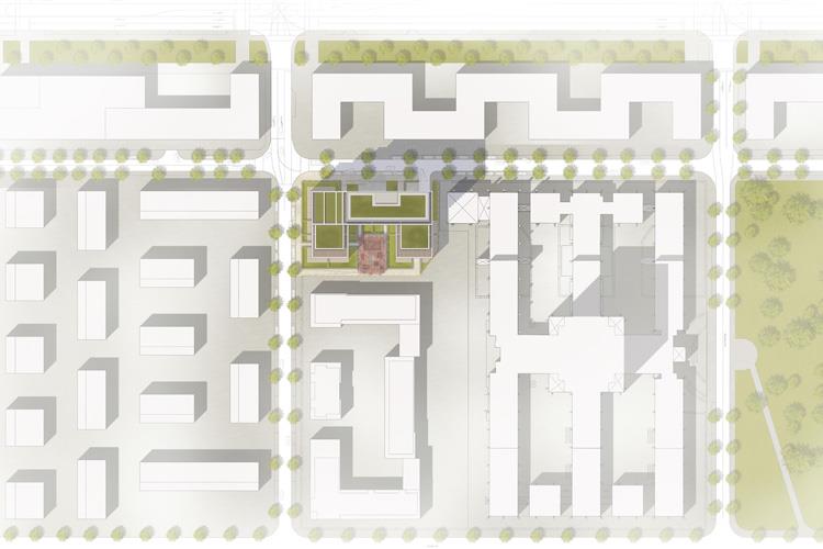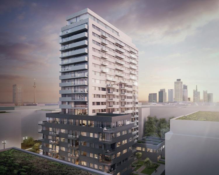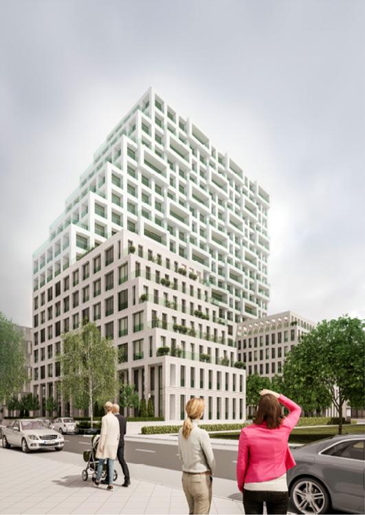 "Der Entwurf von KSP Jürgen Engel Architekten konnte durch seine harmonische Verbindung von Sockelgebäude und Wohnhochhaus überzeugen. Auf diese Weise wird ein ausdrucksstarkes Gesamtensemble geschaffen, welches sich in die Bestandsbebauung integriert und zugleich als markanter Hochpunkt in Erscheinung tritt. Während die Sockelbebauung C-förmig einen zentralen Garten umrahmt, entwickelt sich das Wohnhochhaus mit 19 Obergeschossen circa 60 Meter in die Höhe und staffelt sich dabei in Richtung Westen in mehreren Stufen zurück. Der Entwurf sieht auf einer Wohnfläche von rund 14.300 m² insgesamt rund 180 Wohnungen mit offen gestalteten Wohngrundrissen vor.