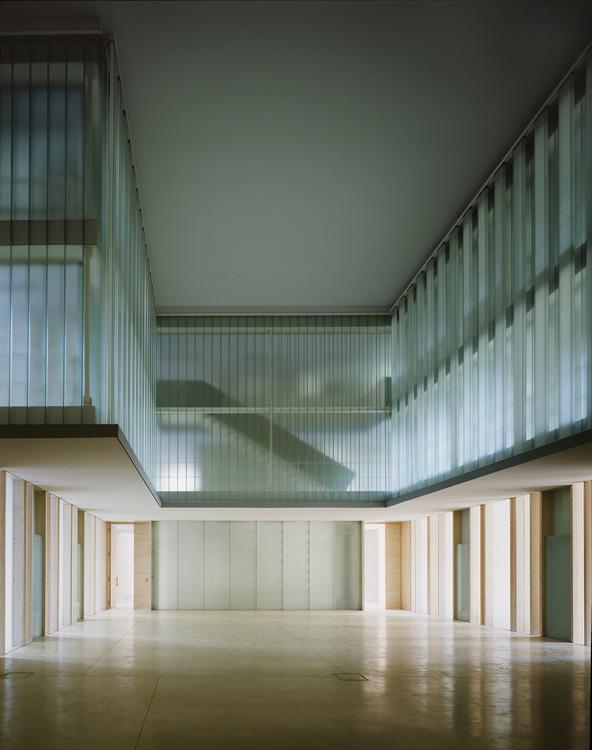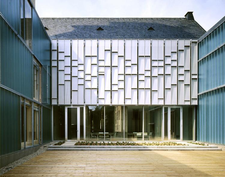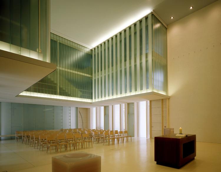 Die ehemalige Jugendstilkirche vom Ende des 18. Jahrhunderts wurde im Krieg stark beschädigt und wieder mit einem neuen Dachstuhl versehen. Doch die Um- und Anbaumaßnahmen der 60er Jahre haben ihr noch mehr zugesetzt. Die Ostseite wurde mit einem Gemeindesaal zugebaut, die Südseite erhielt im Innenraum eine Orgelempore. Die Westseite erhielt einen Anbau für die Aktivitäten der Jugend. Mit dem wirren Ergebnis unterschiedlicher Stile und Erscheinungen im Inneren wie im Äußeren konnte niemand zufrieden sein. Mit dem Zentrum Verkündigung erwuchs die Aufgabe, das Heterogene zum Homogenen umzuwandeln und dem Neuen eine entsprechende Prägung zu geben. Das Kirchenschiff wurde als einheitlicher Baukörper wieder hergestellt und dem Innenraum der Kirche die ehemals vorhandene Lichtdurchdringung wieder zurückgegeben. Mit der Verkleinerung des sakralen Raumes entstanden zusätzliche Räume: das Foyer im Erdgeschoss, ein Meditationsraum und die Bibliothek, die den Sakralraum im Obergeschoss umschließt. Das alte Pfarrhaus wurde in das Konzept ebenso integriert wie die neuen Anbauten und Ergänzungen, welche die Neubauteile mit einer gläsernen Luftkollektorhülle umgeben und damit vom alten Kirchengebäude absetzen. Im Inneren sind unter den Kriegsverletzungen die Reste der Jugendstilarchitektur aufgetaucht. Die neuen Bauelemente stehen unter dem Diktat puristischer Reduktion unter Verwendung zeitgemäßer Materialien, die eher der heutigen Industriearchitektur zuzuordnen sind. Die Balance zwischen Banalem und Spirituellem gelingt durch die Wahrhaftigkeit dieser Materialität und einer perfekten Verarbeitung. Die Kohärenz von Materialität und Gestalt in Verbindung mit dem Torso des Vergangenen wird damit überall spürbar und verleiht dem Inneren jene Spiritualität, die in der Eingangssituation leider nicht eingelöst werden kann.