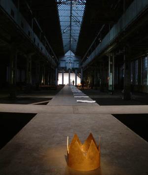 Große lange und leere Halle mit Oberlicht, vorne liegt eine goldene Papierkrone auf dem Boden