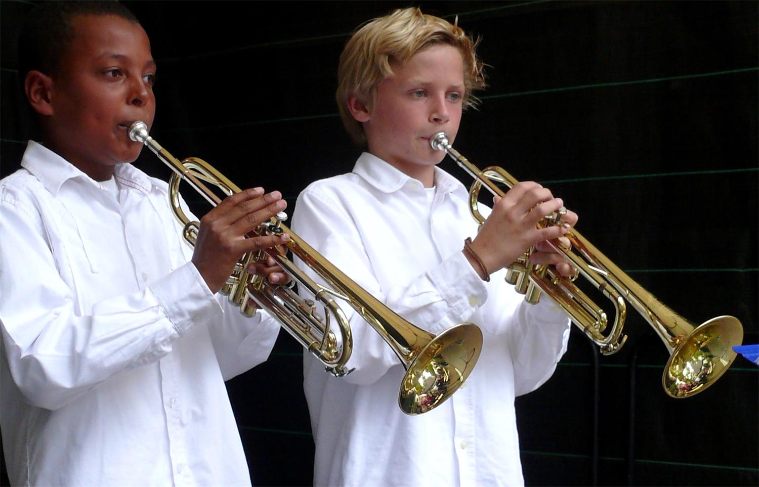 Viele Kinder stehen auf einer Bühne und heben die Hände über den Kopf
