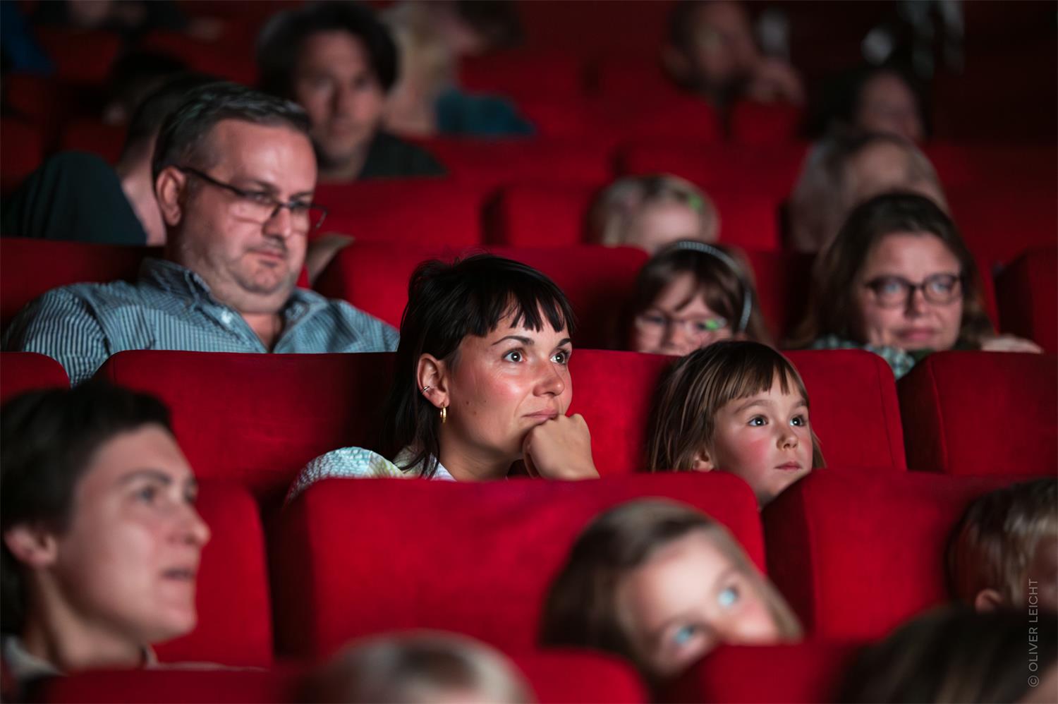 Publikum in roten Kinosesseln verfolgt konzentriert eine Filmvorführung, Kinder und Erwachsene schauen gespannt auf die Leinwand.