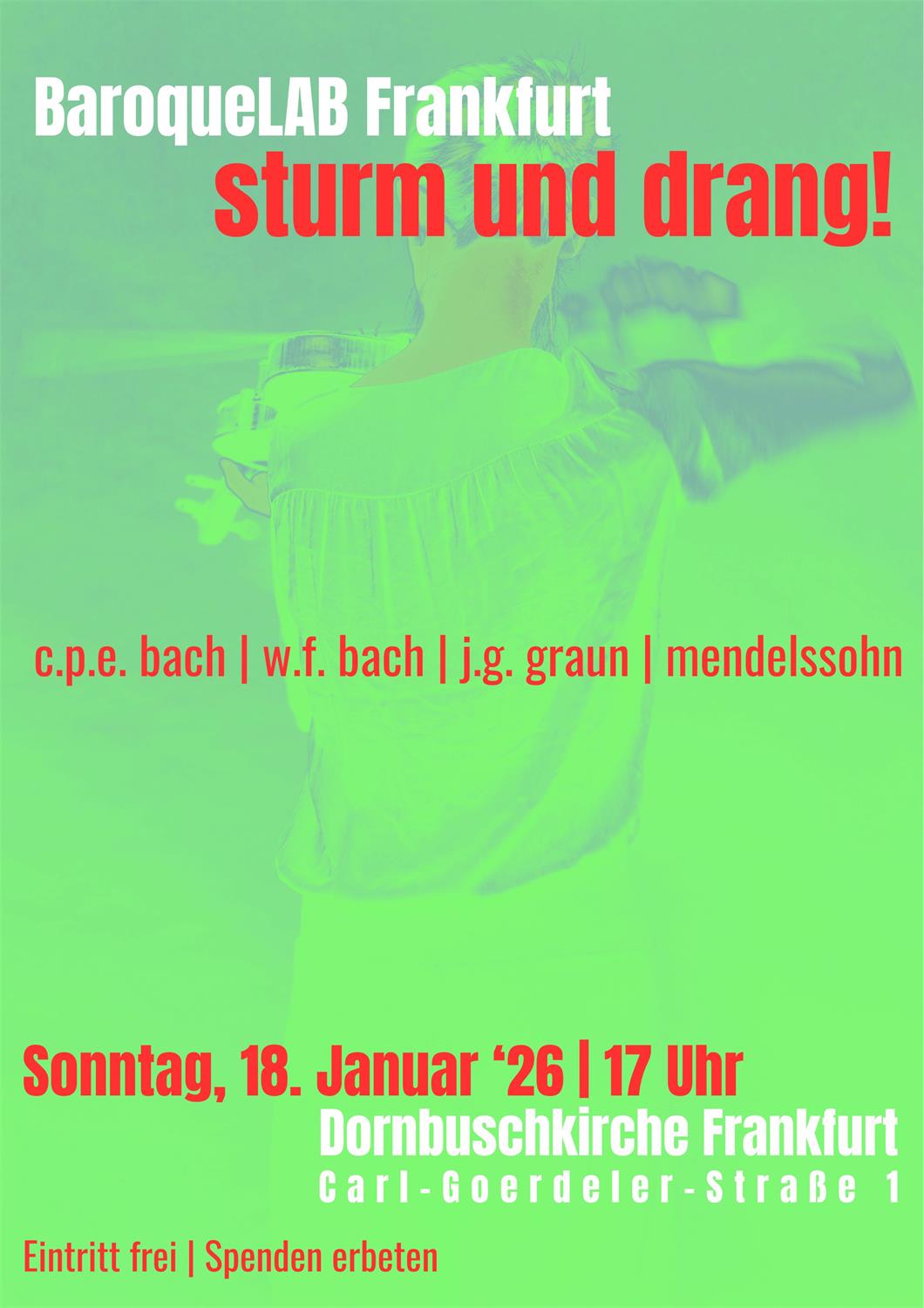 Das Ensemble BaroqueLAB Frankfurt präsentiert am 18. Januar 2026 sein neues Konzertprogramm „Sturm und Drang“ in der Dornbuschkirche. Mit Werken von Carl Philipp Emanuel Bach, Felix Mendelssohn, Wilhelm Friedemann Bach u. a. begibt sich das junge Ensemble in die Welt des Sturm und Drang.
