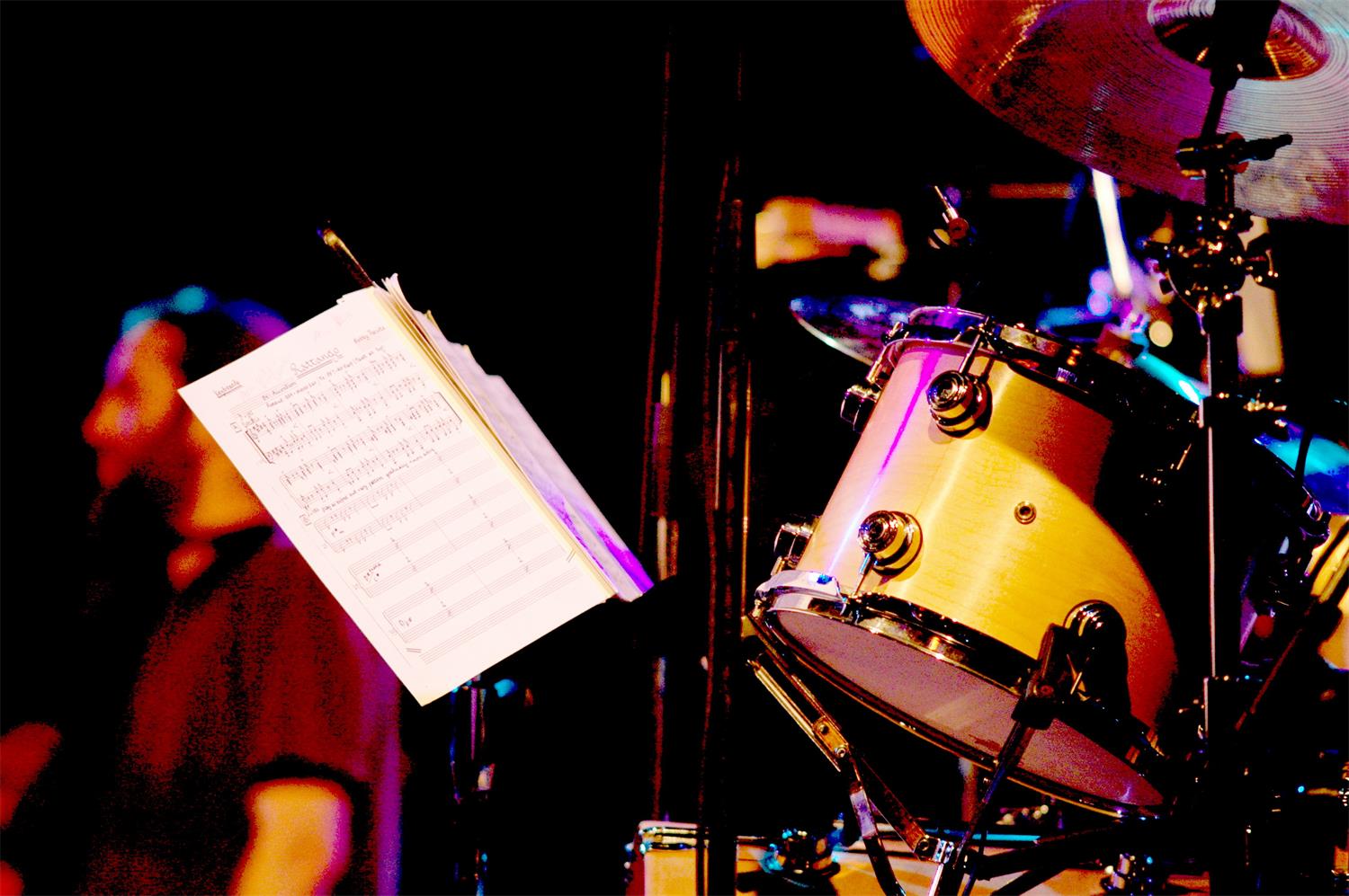 Teile eines Schlagzeugs mit einem Notenständer davor