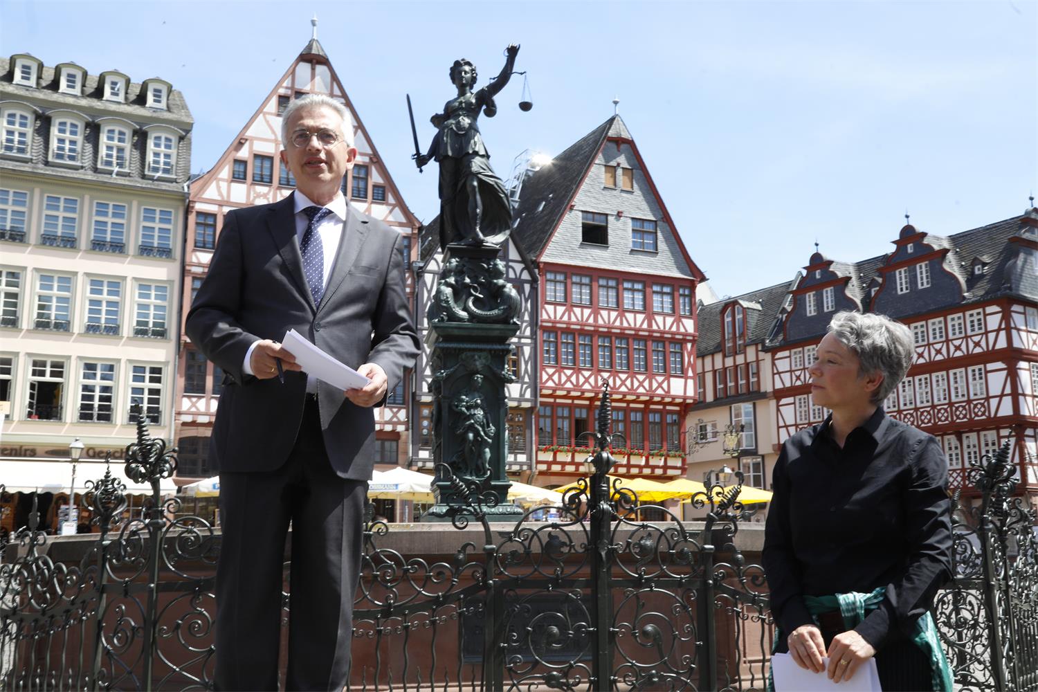 Mit dem Gerechtigkeitsbrunnen auf dem Römerberg läuteten Oberbürgermeister Peter Feldmann und Kulturdezernentin Dr. Ina Hartwig die Brunnensaison 2020 ein und beendeten damit auch die Sanierungsarbeiten an dem Frankfurter Wahrzeichen. Der Brunnen erhielt nicht nur ein neues Ziergitter, auch die sanierte Justitia kehrte auf den Römerberg zurück. „Die Frankfurterinnen und Frankfurter haben ihre Justitia vermisst, umso größer ist meine Freude, dass sie jetzt, endlich, wieder da ist. Sie ist weit über die Grenzen unserer Heimatstadt hinaus bekannt und ein wirklich sehr beliebtes Fotomotiv. Die Justitia gehört einfach auf unseren Römerberg“, sagte Oberbürgermeister Peter Feldmann. „Weltweit ist der Gerechtigkeitsbrunnen einer der wenigen Brunnen, die der Göttin der Gerechtigkeit geweiht sind. Ein bemerkenswertes Detail der Frankfurter Justitia ist das Fehlen der sonst üblichen Augenbinde.“ Im vergangenen Jahr wurden die Rohre in der Figur durch Säure beschädigt und mussten saniert werden.