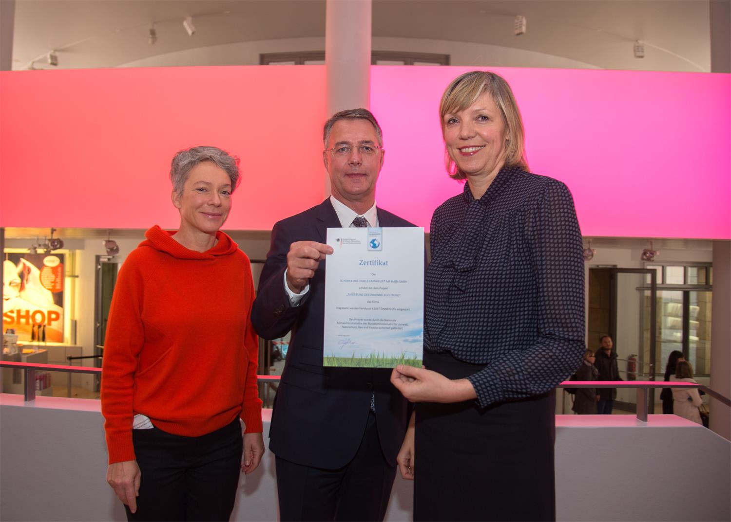 Gunther Adler, Staatssekretär im Bundesumwelt- und -bauministerium, hat der Schirn Kunsthalle Frankfurt heute das Zertifikat für die erfolgreiche Umstellung der Innenbeleuchtung auf LED überreicht. 1.796 Lichtpunkte wurden in der Kunsthalle saniert. Damit werden rund 86 Prozent weniger Strom verbraucht und in den nächsten 20 Jahren knapp 4.200 t CO2 eingespart. Die Umstellung wurde mit rund 160.000 Euro durch die Kommunalrichtlinie im Rahmen der Nationalen Klimaschutzinitiative (NKI) gefördert.