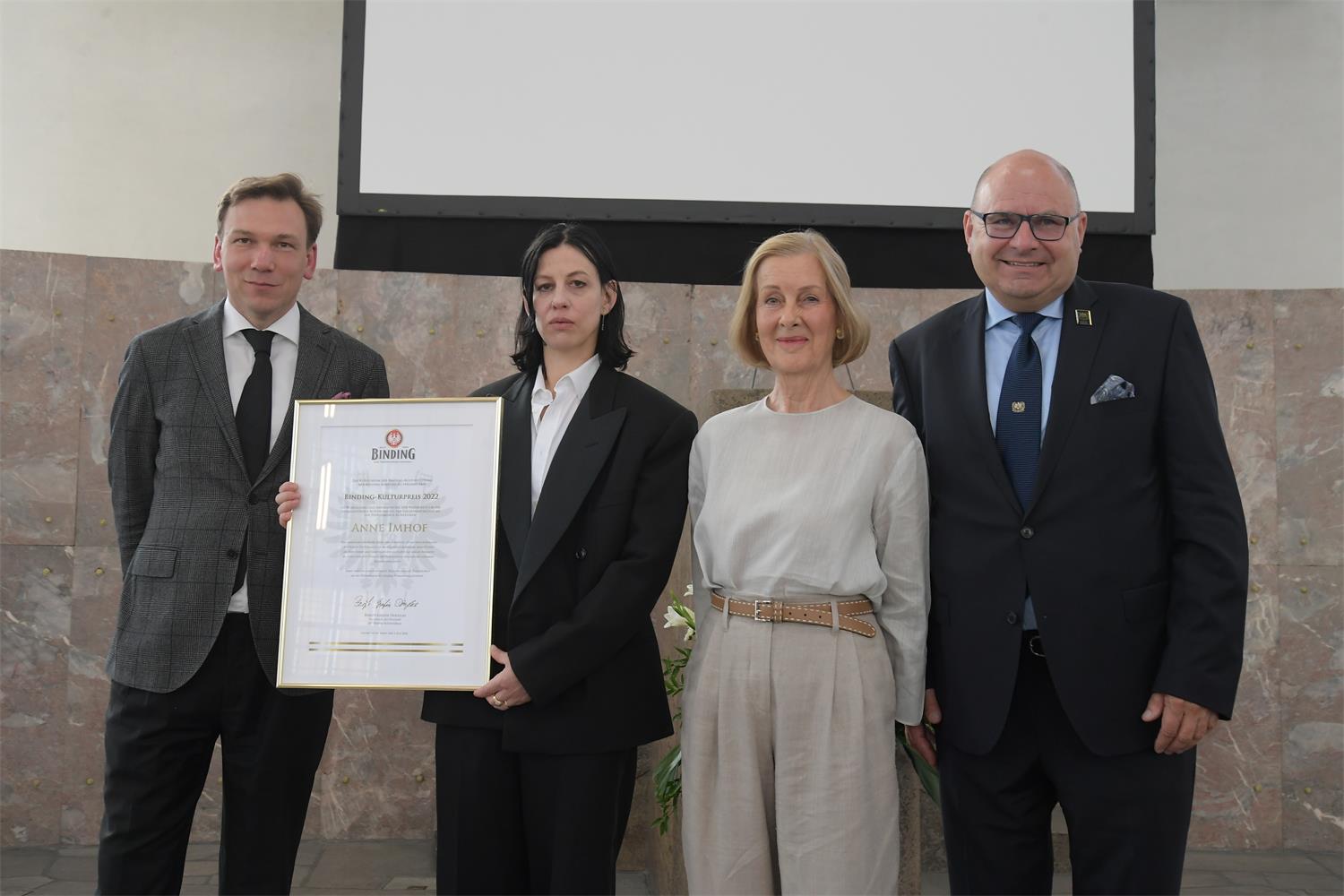 „Anne Imhofs Gegenwartskunst sorgt international für Aufsehen und bereichert die Kunstwelt. Mit ihr gesellt sich eine weitere kulturelle Maßstäbe setzende Persönlichkeit aus der Rhein-Main-Region zu den stets herausragenden Preisträgern unserer Auszeichnung“, so Bergit Gräfin Douglas, Vorstandsvorsitzende des Stiftungsvorstands der Binding-Kulturstiftung. „Es erfüllt mich mit Stolz, dass Anne Imhof von Frankfurt aus ihren Weg in die internationale Kunstszene gefunden hat. Sie gilt heute als eine herausragende Erneuerin der zeitgenössischen Kunst und ist eine weltweit ausgestellte und gefeierte Künstlerin. Mit ihren Arbeiten reißt sie immer wieder Grenzen ein, imaginäre wie tatsächlich vorhandene“, ließ Kulturund Wissenschaftsdezernentin Dr. Ina Hartwig ausrichten. „Ich freue mich über die Entscheidung des Kuratoriums, Anne Imhof mit dem diesjährigen Binding Kulturpreis auszuzeichnen.“