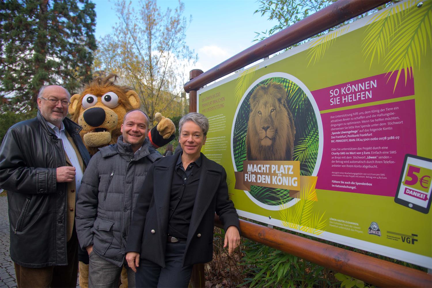 Die Erweiterung der Löwen-Außenanlage musste wegen des Neubaus der Pinguin-Anlage allerdings erst einmal zurückgestellt werden. „Für unsere Asiatischen Löwen wünschen wir uns seit Langem mehr Platz auf der Außenanlage“, so Niekisch, „aber zwei große Baustellen zur gleichen Zeit wäre nicht zuletzt auch eine Belastung für unsere Besucher, deshalb musste das Löwen-Projekt leider erst einmal warten. Doch nun ist der Abschluss des Pinguin-Projekts absehbar und wir können den Umbau der Löwen-Anlage mit voller Kraft vorantreiben.“ Einen wesentlichen Schritt vorwärts gebracht wurde das Löwen-Projekt durch die Stiftung Zoo Frankfurt, deren Schirmherrin Dr. Ina Hartwig ist. Die Stiftung hat eine Summe von 75.000 Euro für die Planung und den Umbau der Anlage zur Verfügung gestellt und damit den Grundstock für die Erstellung der Pläne geschaffen.