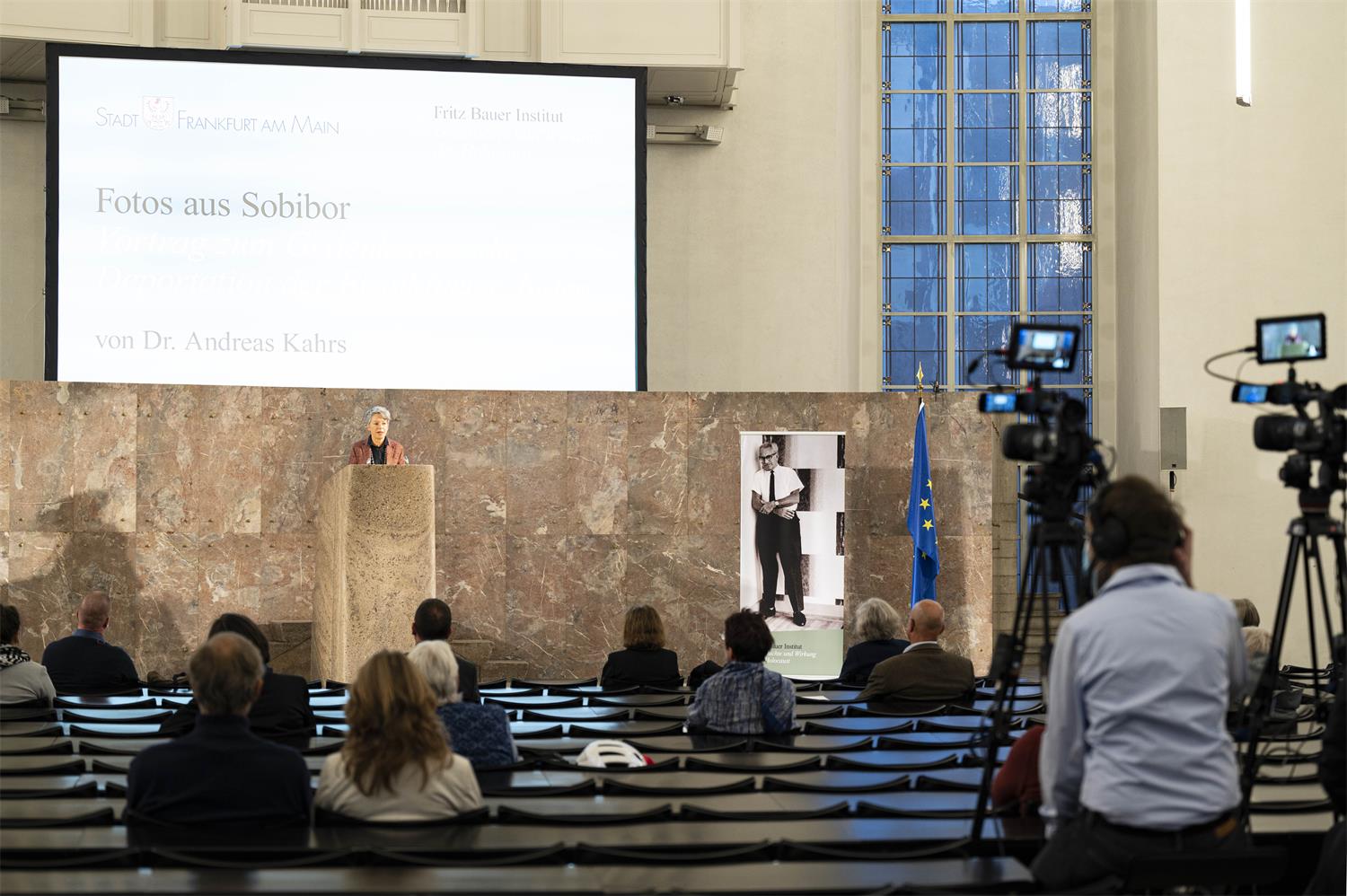 Andreas Kahrs ging in seinem Vortrag auf eine neu entdeckte Fotosammlung zu den Verbrechen der Euthanasie und des Holocaust ein. Die Sammlung gehörte dem ehemaligen stellvertretenden Kommandanten des Vernichtungslagers Sobibor, Johann Niemann, und bietet erstmals Einblicke in das Lager. Durch drei Deportationen aus Frankfurt in den Distrikt Lublin, eine davon direkt nach Sobibor, ist diese Mordstätte für die Verfolgungsgeschichte der Frankfurter Jüdinnen und Juden von besonderer Bedeutung. Die Nationalsozialisten brachen das Lager 1943 vollständig ab und versuchten, die Spuren ihrer Verbrechen zu verwischen.