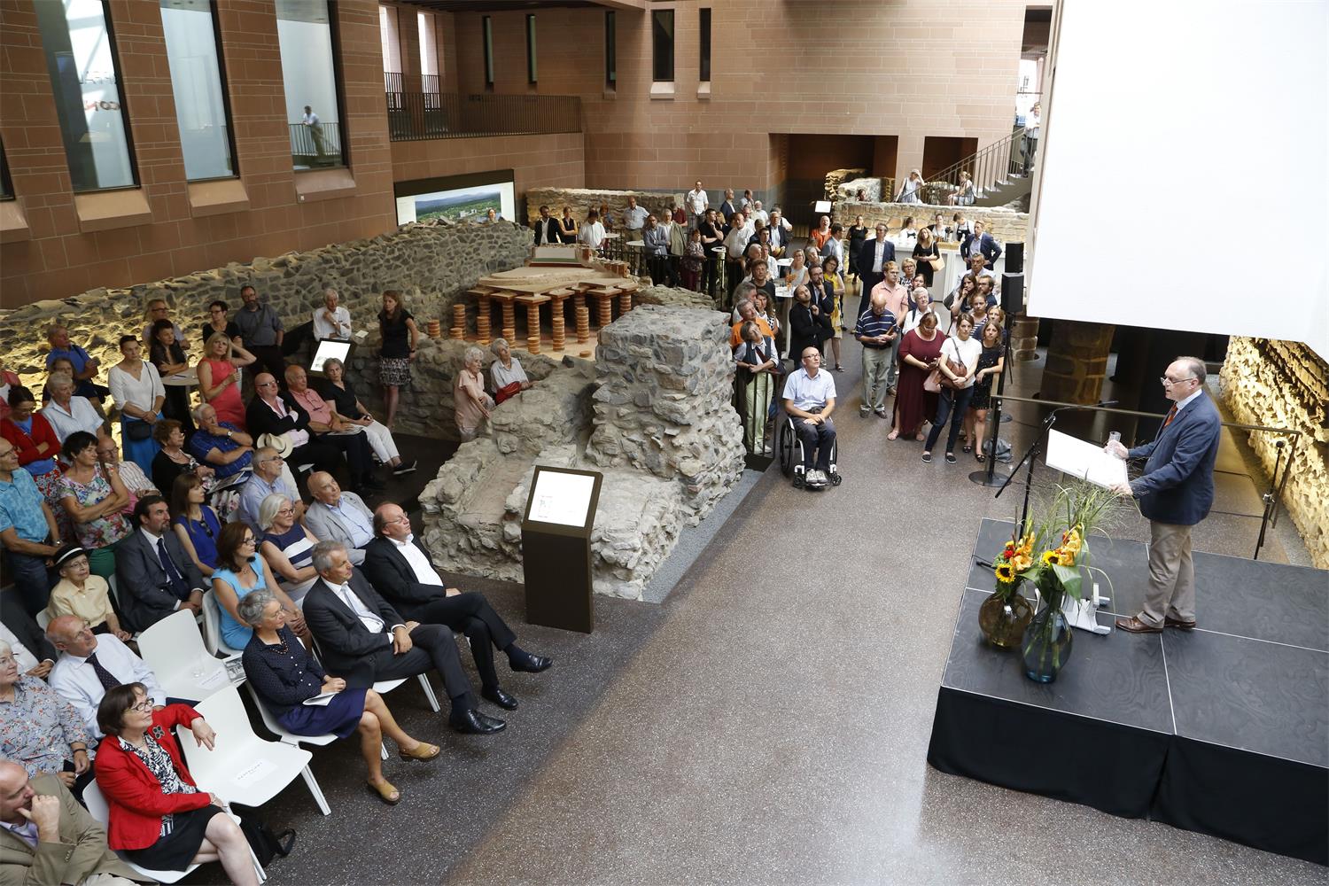 Dr. Hartwig, Dr. David und Michael Guntersdorf, Geschäftsführer der DomRömer GmbH als Bauherr dankten in ihren Ansprachen allen am Projekt beteiligten, insbesondere Prof. Egon Wamers, dem ehemaligen Direktor des Archäologischen Museums, der das Projekt von Anfang an bis zur Fertigstellung betreute. Prof. Wamers gab anschließend in seiner Rede eine Einführung in die Konzeption der Neupräsentation und erläuterte die historische Bedeutung des Ortes.
