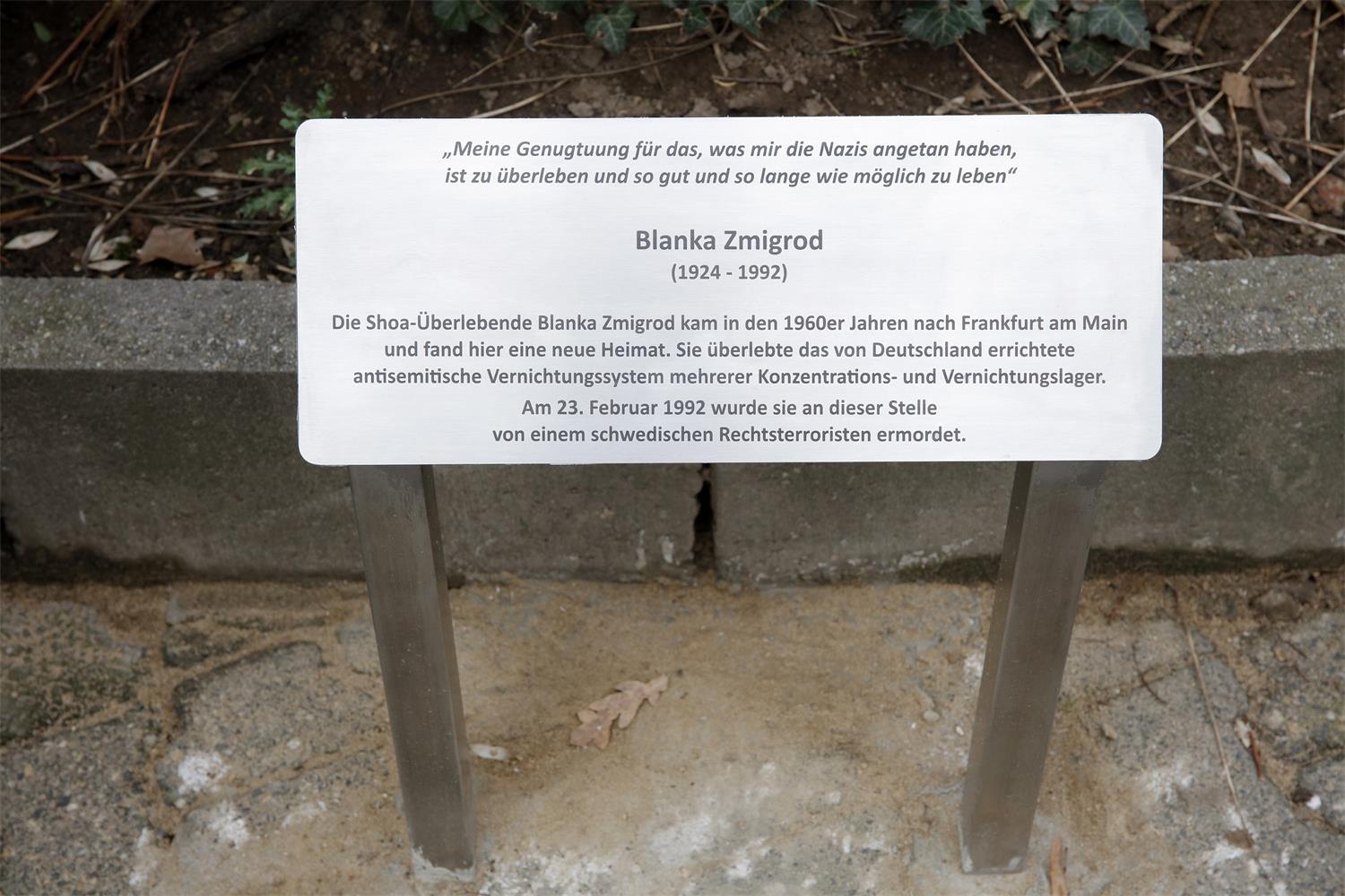 Die Shoah-Überlebende Blanka Zmigrod kam in den 1960er Jahren nach Frankfurt am Main und fand hier eine neue Heimat. Sie überlebte das von Deutschland errichtete antisemitische Vernichtungssystem mehrerer Konzentrations- und Vernichtungslager. Am 23. Februar wurde sie an dieser Stelle von einem schwedischen Rechtsterroristen ermordet.