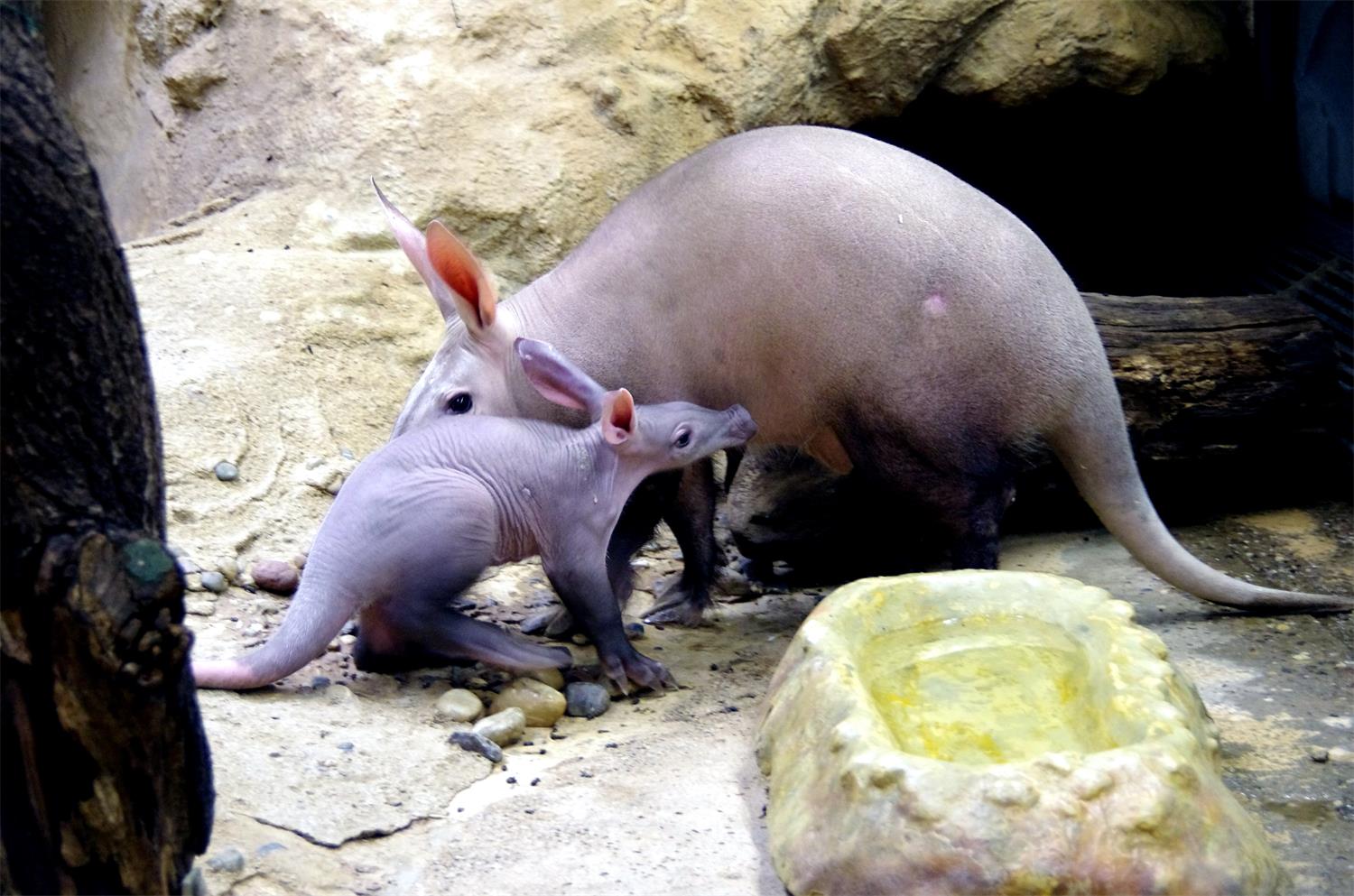 Mit sieben Wochen wiegt das kleine Erdferkel-Weibchen bereits mehr als 7.000 Gramm. Die zehnjährige Mutter ERMINE macht alles richtig. Die ersten Wochen verbrachten die beiden in der Wurfbox, jetzt ist es für den Nachwuchs an der Zeit, die Anlage kennenzulernen, die die Erdferkel mit Springhasen und Senegalgalagos teilen. „Für das Jungtier ist es kein Problem, ohne Vater aufzuwachsen“, erklärt Kurator Dr. Johannes Köhler, „Erdferkel sind Einzelgänger. Die Väter spielen bei der Jungtieraufzucht keine Rolle. Wie lang die Jungtiere wildlebender Erdferkel gesäugt werden, ist nicht bekannt. Wie überhaupt einiges die Art betreffend im Dunklen liegt. Es werden derzeit von der Weltnaturschutzunion IUCN auch keine Angaben zum Populationstrend gemacht. Geschuldet ist das der verborgenen Lebensweise der Tiere.“