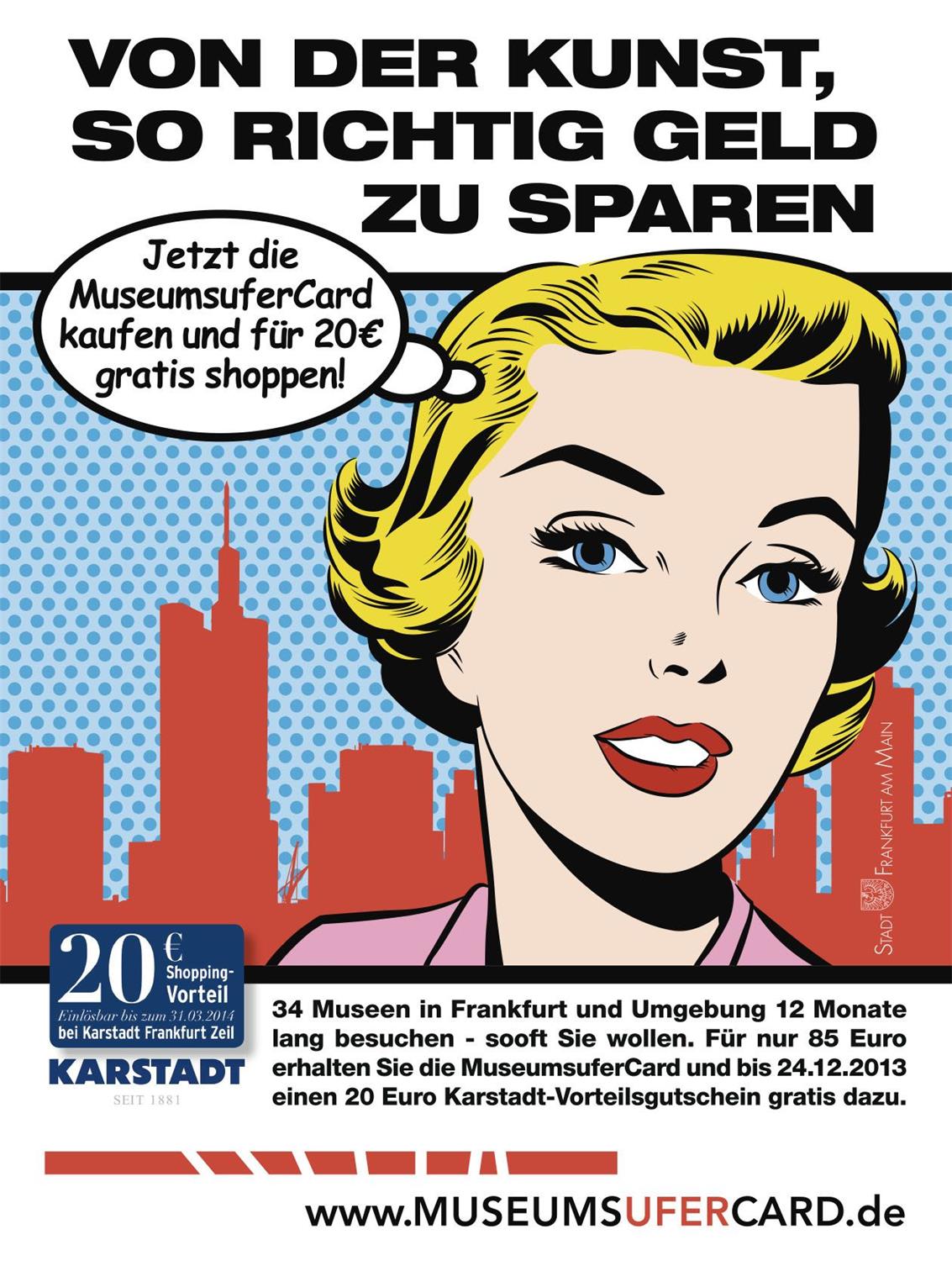 Die MuseumsuferCard ist die kunstvollste Geschenkidee zu Weihnachten für Frankfurter und Kulturinteressierte aus der Rhein-Main-Region. Dabei handelt es sich um die Jahreskarte für 34 Museen in Frankfurt und Umgebung, die ein Jahr unbegrenzten Kunst- und Kulturgenuss in allen Dauer- und Sonderausstellungen verspricht. Wer die Karte bis Heiligabend zum regulären Preis von 85 Euro kauft, erhält zusätzlich einen 20 Euro-Vorteilsgutschein von Karstadt Frankfurt auf der Zeil gratis dazu.