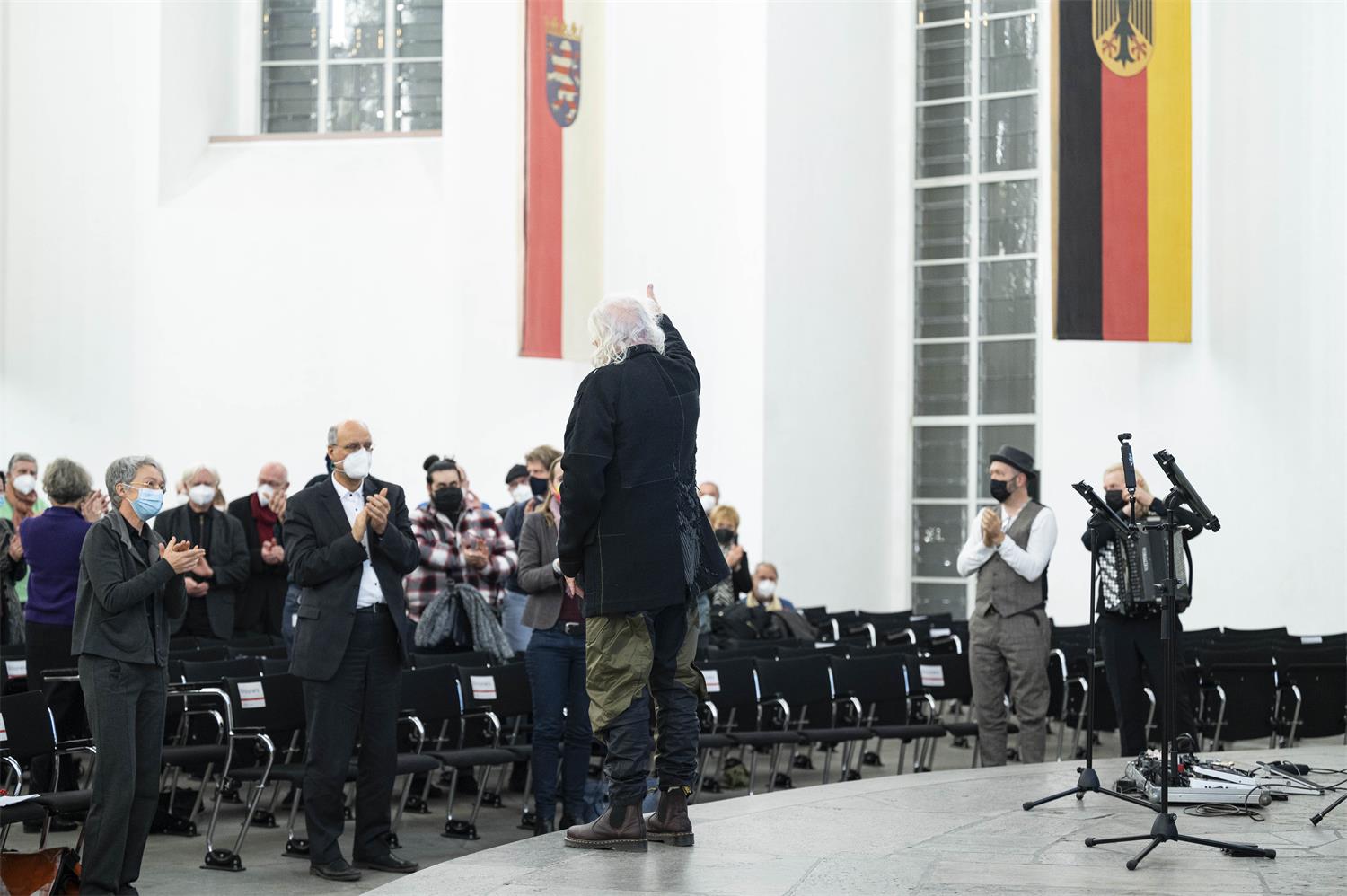 Die Feierstunde wurde von Gregor Praml am Kontrabass und Vassily Dück am Akkordeon begleitet. Filmausschnitte zeigten Teile der Inszenierung von Goethes Faust I und II, die Willy Praml 1994 mit Frankfurter Bürgerinnen und Bürgern in der Paulskirche aufführte.