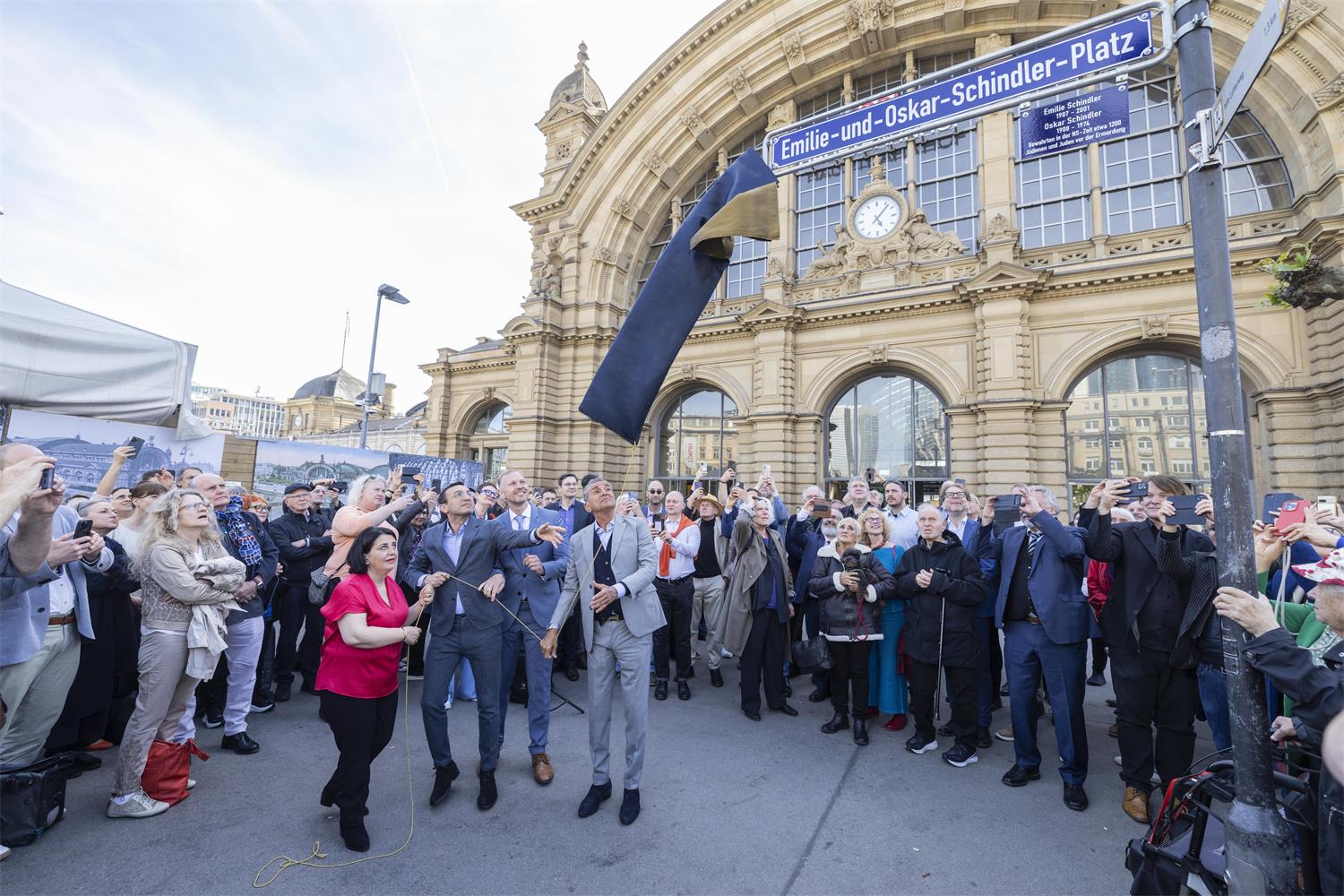 Am Sonntag, 27. April, wurde der Vorplatz des Frankfurter Hauptbahnhofs offiziell in „Emilie-und-Oskar-Schindler-Platz“ umbenannt. Es war der Vorabend von Oskar Schindlers 118. Geburtstag. Oberbürgermeister Mike Josef, Ortsvorsteher Michael Weber und Prof. Dr. Dr. Michel Friedman, der Schindler persönlich kannte, dessen Eltern von ihm gerettet wurden und der sich seit langem für die Benennung engagiert, enthüllten am Nachmittag das neue Straßenschild. Am Abend wurde der neue „Emilie-und Oskar-Schindler-Platz“ in Frankfurt im Kaisersaal des Rathauses mit einem Empfang gefeiert. Neben den Genannten sprachen in einer von Michael Weber moderierten Runde die stellvertretende Vorsteherin des Ortsbeirats 1, Petra Thomsen, sowie die Zeitzeugin Prof. Erika Rosenberg-Band und der Zeitzeuge Michael Trautwein.