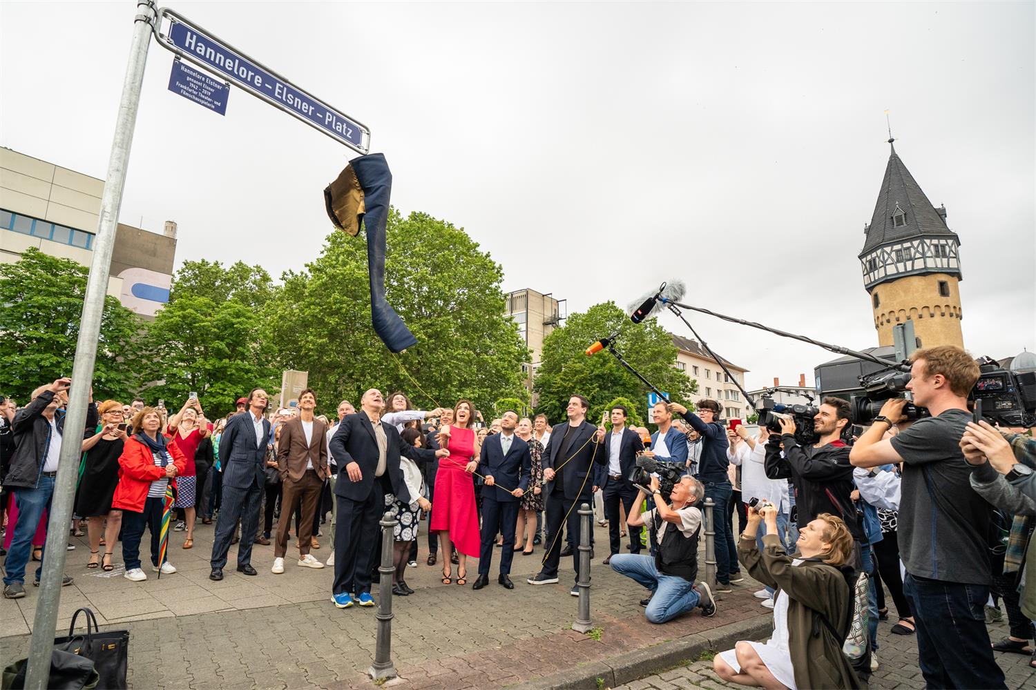 Der geschichtsträchtige Platz an der Bockenheimer Warte mit dem schönen Turm aus dem 15. Jahrhundert wird künftig eine der bekanntesten Schauspielerinnen Deutschlands ehren: Hannelore Elsner. Am 30. Juni um 11 Uhr wurde der Platz feierlich durch Oberbürgermeister Mike Josef und den Ortbeirat 2 feierlich der Öffentlichkeit übergeben. Die Einweihung fand in Anwesenheit ihres Sohns Dominik Elstner – er hatte gemeinsam mit den Mitgliedern des Ortsbeirates 2 zur Benennungsfeier eingeladen - und langjähriger Wegbegleiterinnen und Wegbegleiter wie u.a. der Schauspieler Iris Berben und Florian David Fitz, des Regisseurs Oskar Roehler, dem Produzenten Nico Hoffmann und Marika George von der Götz George Stiftung, statt. Moderiert wurde die Veranstaltung von Prof. Dr. jur. Dr. phil. Michel Friedman, einem persönlichen Freund Elsners. Der Ortsbeirat 2 der Stadt Frankfurt hat die Benennung im Oktober 2022 beschlossen.