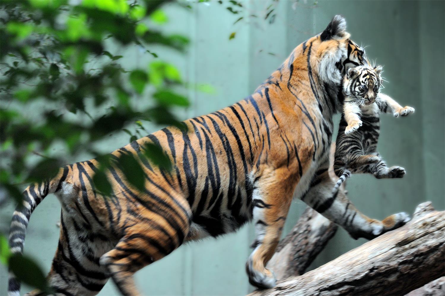 Tiger mit Jungtier im Maul läuft auf einem Baumstamm
