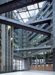 Besonders mit Wärmequellen belastete Räume werden außerdem durch die sogenannte Betonkernaktivierung gekühlt: Dabei sorgt kaltes Wasser in den Decken für eine Kühlung der darunterliegenden Räume. Das Klima in der Halle wird zusätzlich durch eine 2.500 Quadratmeter große Wasserfläche reguliert. Ein Wasserfall schluckt die Geräusche, sorgt aber auch für einen kleinen Showeffekt. „In Niederrad muß man etwas bieten, um die Mieter zu gewinnen“, sagt Oliver Orthey, Projektmanager bei der Hochtief Projektentwicklung.