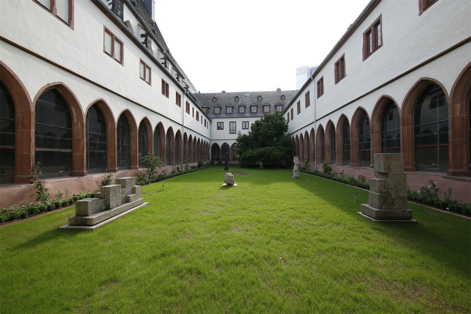 Innenhof einer mittelalterlichen Klosteranlage mit grüner Wiese und modernen Skulpturen