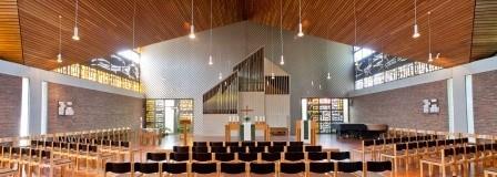 The evangelical Festeburgkirche church was built in 1969. Today, it is regarded as the spiritual, social, and cultural heart of the southern part of Frankfurt’s district of Preungesheim. Music groups, a children’s choir, the Preungesheim ecumenical choir, and the ecumenical brass band have their rehearsals here.